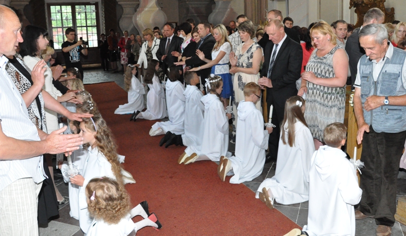 Prieš „Tėve mūsų“ maldą katechetė uždegė vaikų Pirmos Komunijos žvakeles, o kai į kunigo rankose laikomą duonelę nužengė Viešpats, vaikai išsirikiavo priimti Jėzų į savo širdeles.
