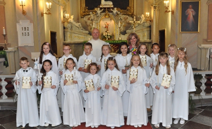 Birželio 9 d. Jiezno parapijos bažnyčioje 16 vaikų priėmė Pirmąją Komuniją. Kaip ir kiekvienais metais, visus mokslo metus vaikus ruošė parapijos katechetė Irena Skulščienė. Nors tądien lijo, visi pasipuošę, su šventine nuotaika sugužėjo į bažnyčią. Klebonas kun. Rolandas šv. Mišių pradžioje kalbėjo: „kada verkiama? Prieš išsiskyrimą. Gal dangus verkia, nujausdamas, kad po Pirmos Komunijos vaikai daugiau nebelankys bažnyčios? Tačiau būna ir džiaugsmo ašaros. Noris tikėtis, kad dangus lieja džiaugsmo ašaras, jog šie vaikai taps nuolatiniais pamaldų dalyviais.“